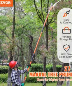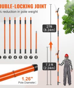 - Cut High or Low: Are you ready to cut into any task? This manual pole saw can be adjusted to various heights with its 8 poles, ranging from 7.3 to 27 ft (2.24 m to 8.24 m). It is designed for trimming high branches, but can also be used as a hand-held saw to prune lower branches, brushes, and logs.